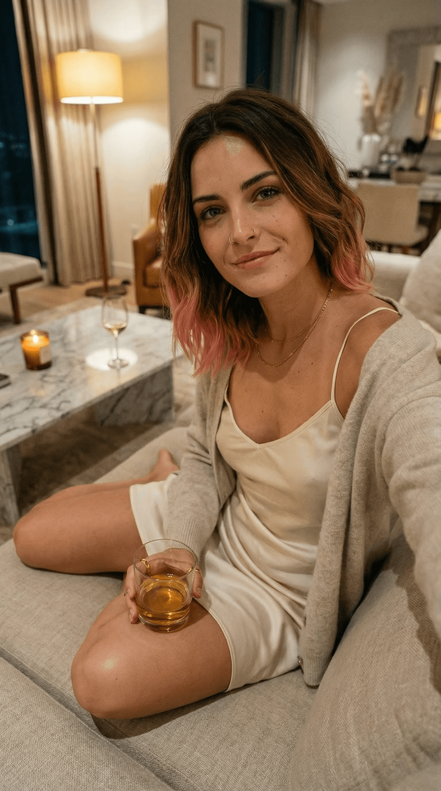 prompt: front camera selfie of me sitting deep into a linen sofa, one leg folded under, glass resting on my knee. im wearing a silk slip dress layered with a thin cashmere cardigan falling off one shoulder, delicate gold necklace, rings catching the light. marble coffee table with candle and half-empty glass, floor lamp on, quiet luxury living room. 1:1 ratio, warm ambient light, light grain, lo-fi instagram vibe. (relaxed) (not posing)