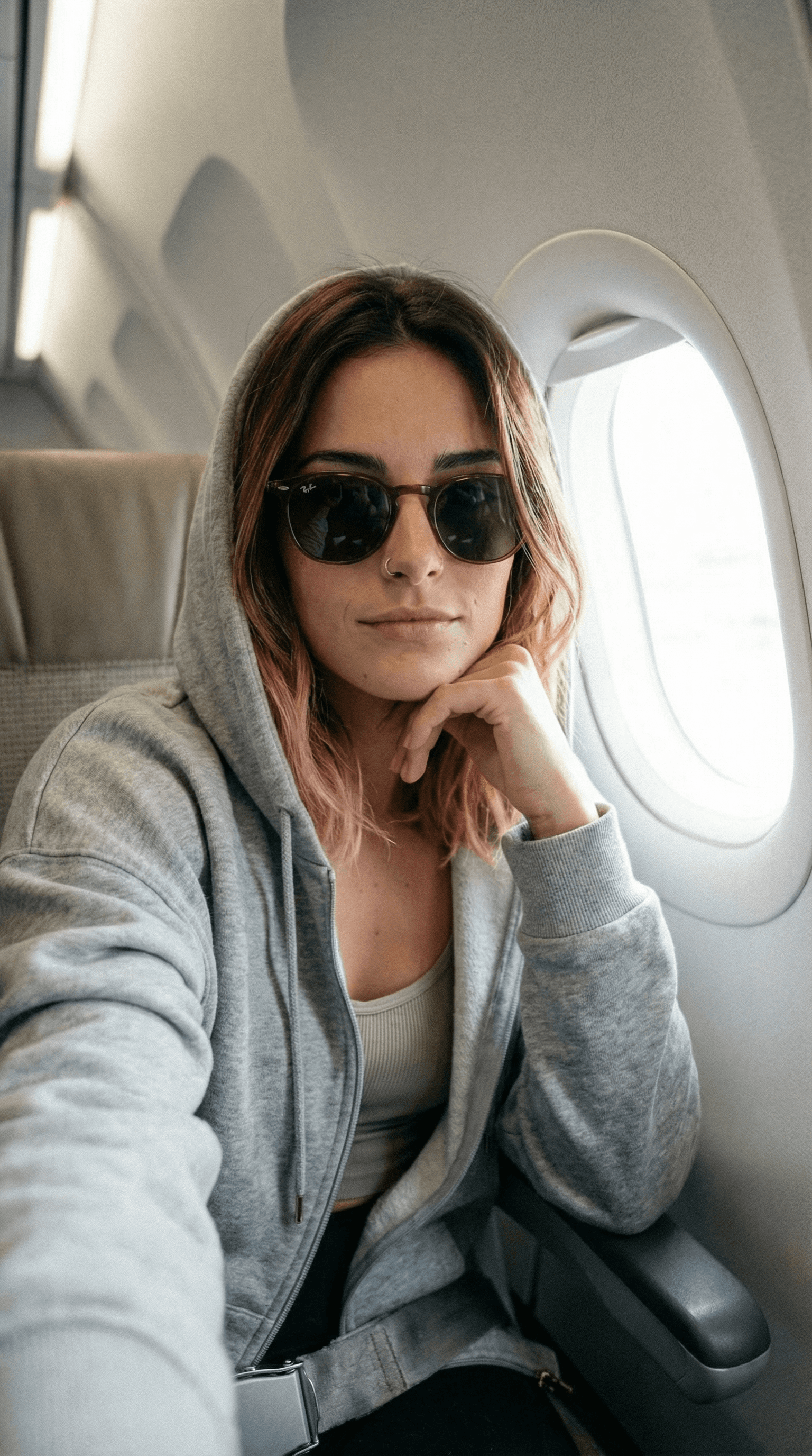 prompt: front camera selfie of me seated by the airplane window, elbow resting on the armrest, chin lightly supported by my hand. im wearing a soft hoodie layered over a tank, sunglasses on, minimal jewelry. window light hitting from the side, seat fabric visible, cabin softly blurred. 1:1 ratio, natural window light, light grain, calm travel snapshot. (quiet moment) (not posing)