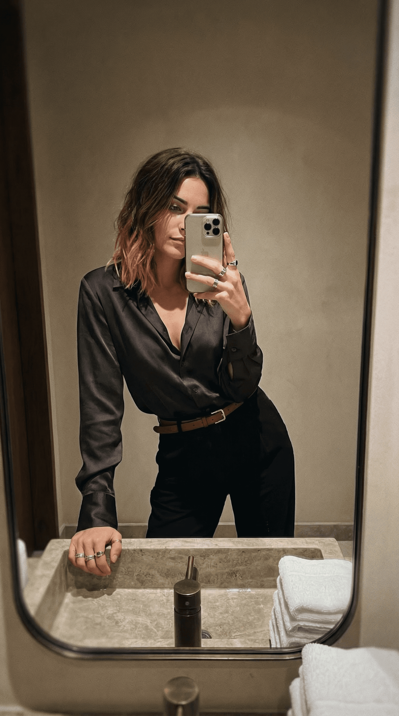 prompt: mirror selfie of me in a softly lit restaurant bathroom, phone covering part of the face, body leaning into the mirror. im wearing a silk blouse slightly unbuttoned, tailored pants, thin belt, rings visible. stone sink, folded towels, warm lighting, slight blur on the edges of the mirror. 9:16 ratio, low warm light, subtle grain, iphone snapshot. (quick snap) (unstyled)