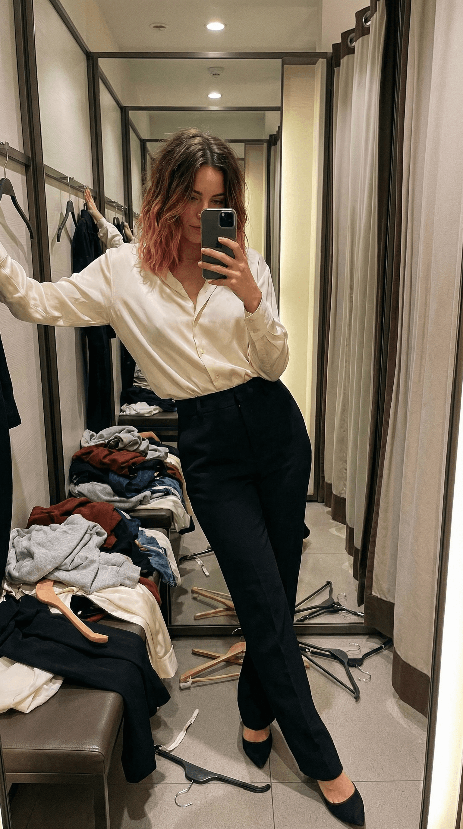 prompt: mirror selfie of me inside a fitting room, phone covering part of the face, hip leaned into the mirror. im wearing a silk top half tucked into tailored trousers, heels slightly kicked off. clothes piled on the bench, hangers scattered, curtain half open, warm spot lighting. 9:16 ratio, indoor store light, subtle grain, raw try-on selfie. (deciding) (unstyled)