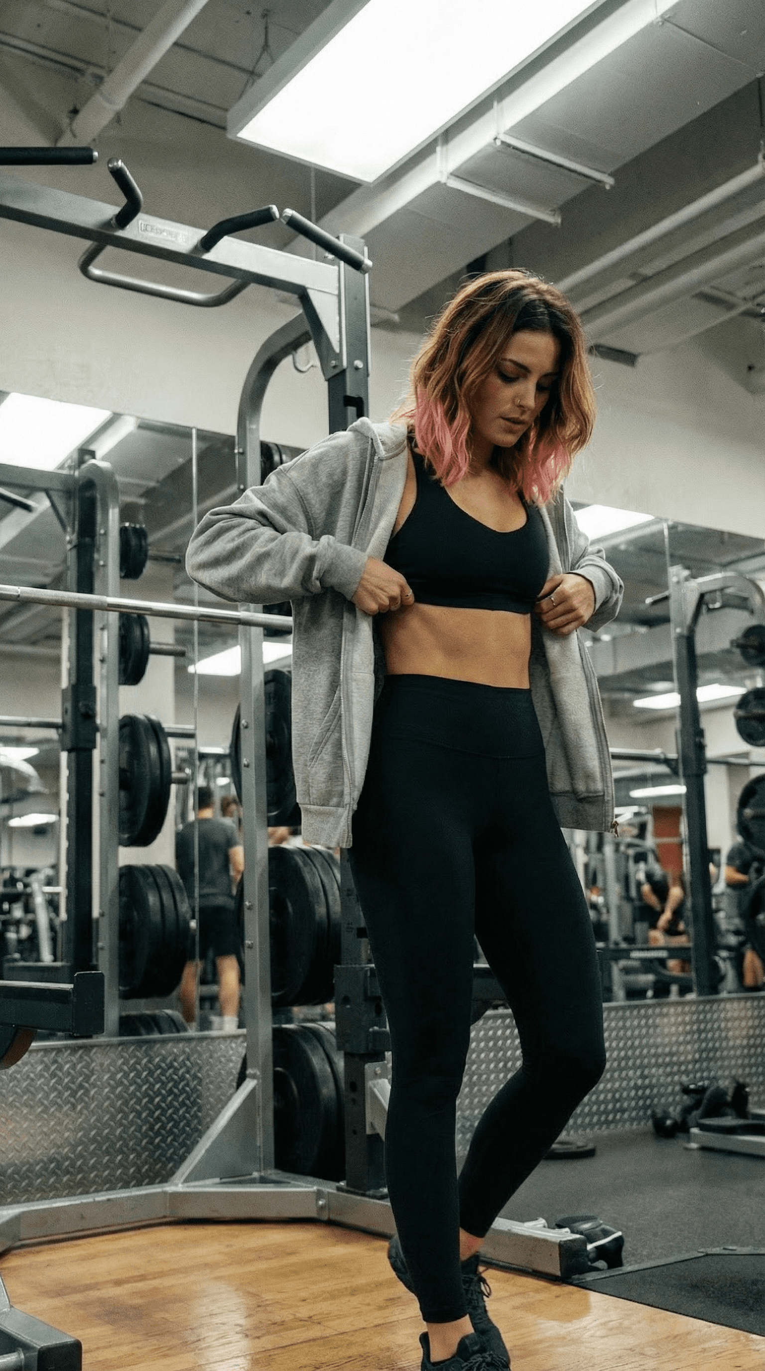 prompt: photo of me taken by a friend inside the gym, caught mid-movement adjusting my workout top. im wearing a fitted sports bra, lightweight zip hoodie worn open, high-rise leggings, sleek trainers. squat rack behind me, plates stacked unevenly, industrial mirrors reflecting the space. 1:1 ratio, harsh overhead light, grainy aesthetic. (in between sets) (not aware of camera)